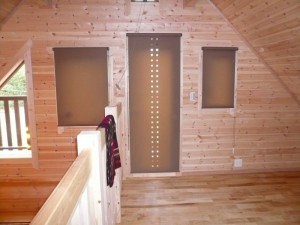 ログハウスの2階ファミリースペースの施工事例です。異なるサイズの窓やドアを同じ生地のロールスクリーンで合わせ、中央のドアのみスクエアのドット柄のデザインカットを施しています。
