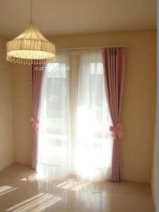 ボトムフリルのレースにピンクのドット柄の遮光カーテンを合わせていただきました。お昼間はレースのフリルとリボンタッセルが可愛らしさを演出してくれます。