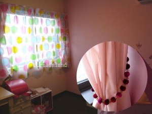 大きな水玉柄のレースを、ピンクのアクセントクロスに合わせてコーディネートしています。後ろの厚地を束ねるタッセルもボンボンタッセルで“丸”を意識したコーディネートです。